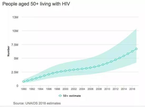 1990~2016 年全球老年 HIV 感染者数量变化 |来源:UNIAIDS