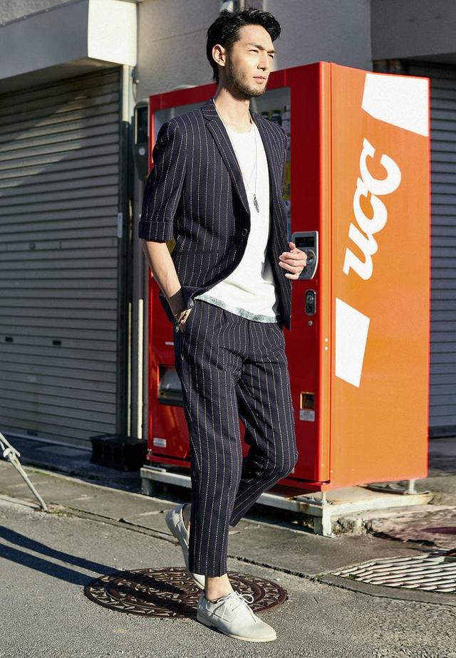 条纹裤子与条纹西装搭配,可以说是绝配了,通体的竖条纹,在视觉上拉伸了身形,使得整体的身高瞬间拔高,内搭一件白t,更添时尚感和层次感。