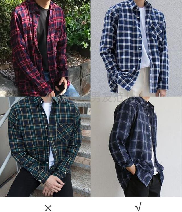 衬衫的选择上,纯色、条纹,格纹都可以派上用场。格纹最好不要明显撞色的,容易显土,简单的白色+其他颜色就好: