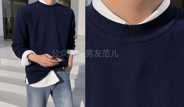 圆领毛衣/卫衣也可以与衬衫组合,但要注意把领口整理好,整齐露出领子的上半部分: