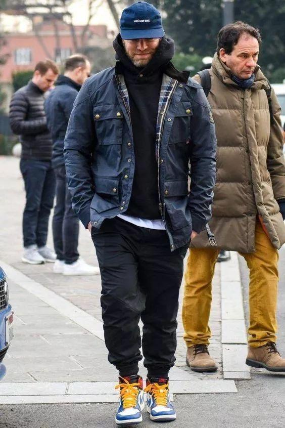 在黑色调的造型中搭配一件蓝色的牛仔夹克,造型的视觉冲击力就变得更强,加上一双运动鞋造型的街头时髦感就更突出。