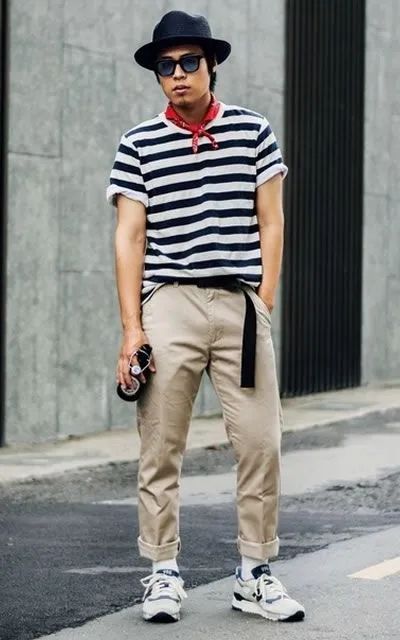 随着纺织业的进步,条纹T恤再也不会局限于蓝白条纹的经典配色,如今的条纹变化更加多样,不同的大小,不同的颜色组合,加上衣物版型的变化都会影响造型风格的走势,所以日常搭配时也要从造型整体的风格入手。